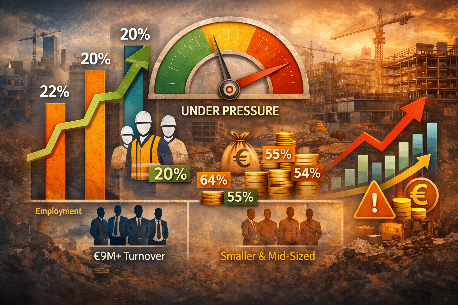 Larger companies (€9M+ turnover) remain the most confident on turnover and new orders, particularly in civil engineering, infrastructure, and specialist contracting. Smaller and mid-sized firms continue to feel cost pressure more acutely.